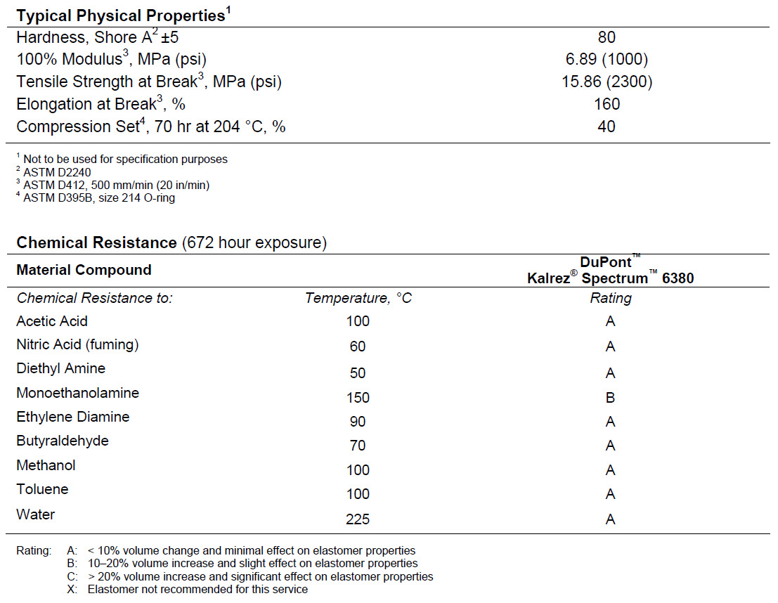 DuPont™ Kalrez® Spectrum™ 6380 perfluoroelastomers parts are a non-black product specifically developed for chemical processes involving hot, aggressive amines. In addition, it has excellent overall chemical resistance (see chart below). This cream colored product is easily identifiable when selecting an O-ring material for harsh chemical plant services. This material has excellent mechanical properties and is a top choice for both static and dynamic sealing applications. A maximum service temperature of 225 °C is suggested while short-term excursions to higher temperatures are permissible.For more information on Kalrez® Spectrum™ 6380, or to see if it might be right for your difficult sealing applications in amines and